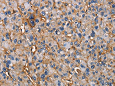 The image on the left is immunohistochemistry of paraffin-embedded Human liver cancer tissue using CSB-PA823804(NT5E Antibody) at dilution 1/50, on the right is treated with fusion protein. (Original magnification: ×200)
